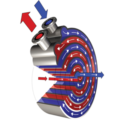 Превосходная очистка и повышенная производительность. Конструкция спиралей SelfClean обеспечивает надежную защиту от засорения при работе со сложными жидкостями, содержащими шлам, суспензии, волокна и твердые частицы.  Каждый контур спирального блока состоит из одного канала. Равномерный изгиб и одноканальная геометрия создает высокую турбулентность, которая препятствует образованию отложений. Если отложения все-таки образуются, скорость потока увеличивается, поскольку через канал должно пройти то же количество жидкости. Поток действует на отложения с большей силой, вымывая их наружу. Дополнительным преимуществом этой конструкции является то, что она исключает появление мертвых зон, что также сказывается на эффективности теплопередачи.